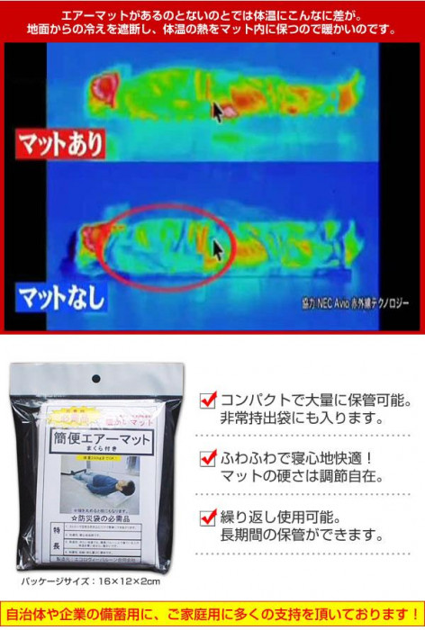 | 避難場所って予想以上に冷えること、ご存知ですか?このエアーマットは付属のストローで膨らますことができ、地面の冷たさ・痛さから身体を守り、快適な睡眠をサポートします。いざという時の備えに! |