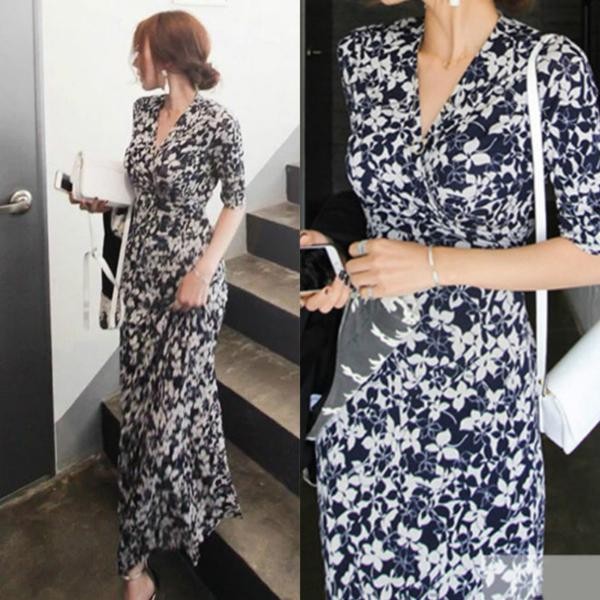 ビーチ&リゾートに最適 Vネックラップドレス ロングドレスワンピース ブルー
