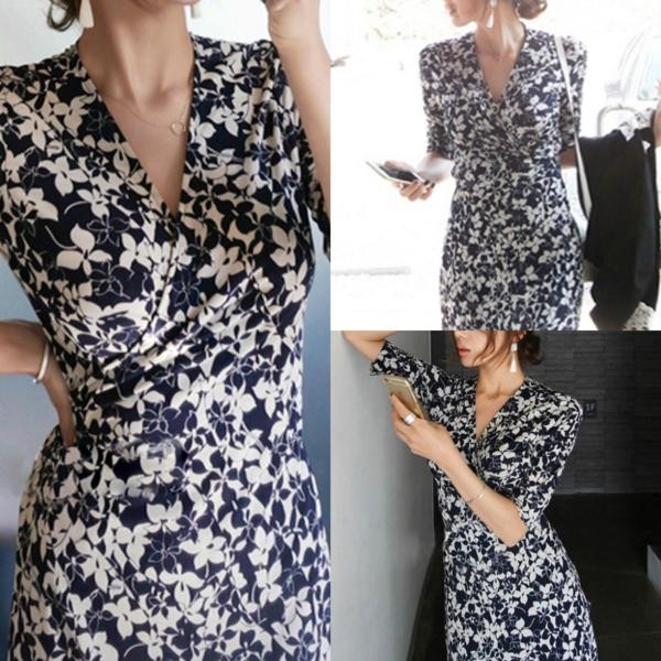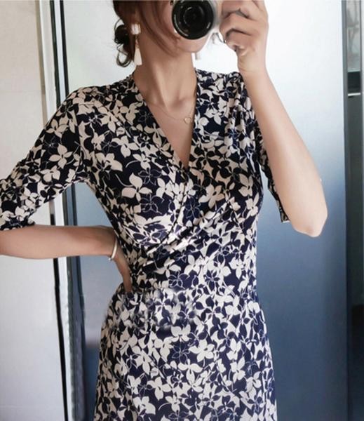 花柄 Vネック コットン ロング 半袖