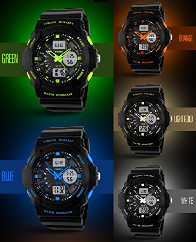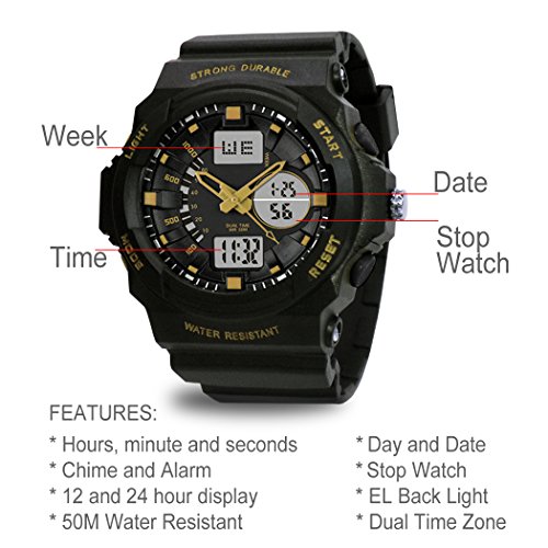 -. Feature : Digital and Analog dual time display / High quality movement and rubber band / Alarm clock, timer, back lighting, calendar, 12H/24H time function / 5ATM Water Resistant for Swimming (Note: Do not Operate The Buttons When The Watch in Water) / PURCHASE WITHOUT WORRY: If the watch is not damaged by non-human factors in a year, please feel free to contact us. We will give you a free replacement watch or a refund , please email to our no question asked! Click the Add to Cart button now on Amazon