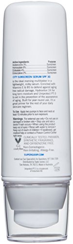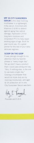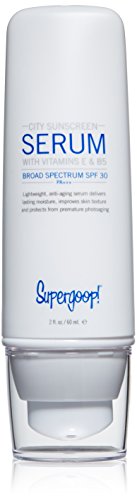 -. Binding : Health and Beauty -. Brand : Supergoop! -. Color : White -. EAN : 0857250005428 -. Feature : Vitamins E and B5 aid nutrient absorption and cell renewal, reducing the look of fine lines and wrinkles / Hydrovotin 24 stimulates the skin's natural moisturizing agent so skin stays hydrated without the need of a heavy cream / Uniprotect PT-3 stimulates the skin's antioxidant pathways and natural enzymatic repair system -. Label : Supergoop! -. Manufacturer : Supergoop! -. PackageQuantity : 1 -. ProductGroup : Prestige Beauty -. ProductTypeName : LUXURY_BEAUTY -. Publisher : Supergoop! -. ReleaseDate : 2016-04-15 -. Studio : Supergoop! -. Title : Supergoop! SPF 30 Anti-Aging City Sunscreen Serum, 2.0 fl. oz. -. UPC : 857250005428