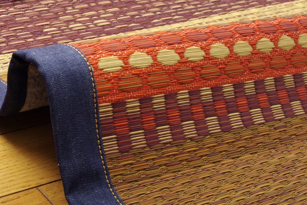 広島県福山市のデニム生地メーカー、カイハラ(株)の生地をヘリで使いました。イ草生地は袋織りという技法で繊細な柄を出しています。折れ曲がりが複雑なので長いイ草を使用しないと切れてしまいます。縦糸が密なので、しっかりとして破れにくいのが特徴です。国産(九州産)のい草を使用しています。一本一本が太く、表皮が厚く繊維がキメ細かいので弾力性があり、耐久性に優れています。い草には空気の自然浄化作用、湿度の調節作用などがあります。い草に青森ヒバ加工を施しています。(抗菌、防臭効果)