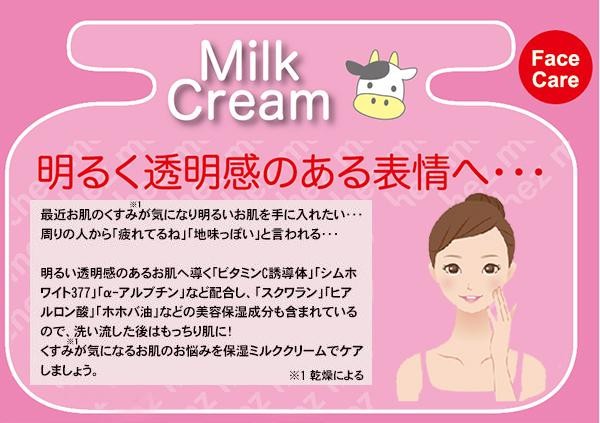 | 「ビタミンC誘導体」「シムホワイト377」「α-アルブチン」などを配合し、「スクワラン」「ヒアルロン酸」「ホホバ油」など美容保湿成分も含まれているので、洗い流した後はもっちり肌に♪乾燥によるくすみが気になる肌のお悩みを、保湿ミルククリームでケア!! |
