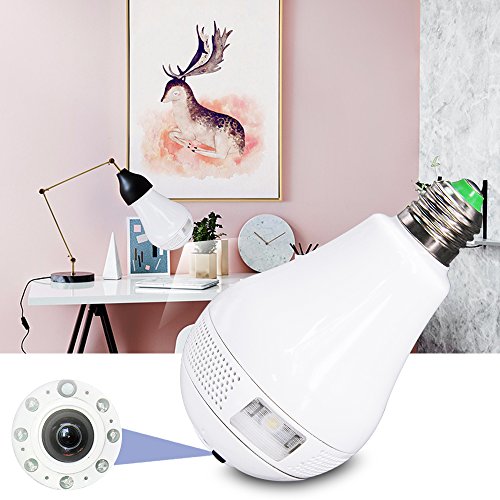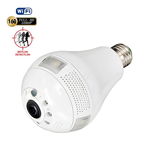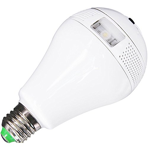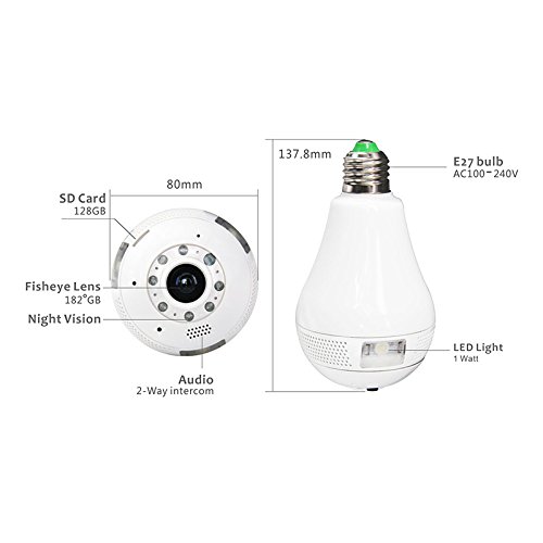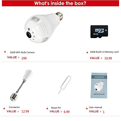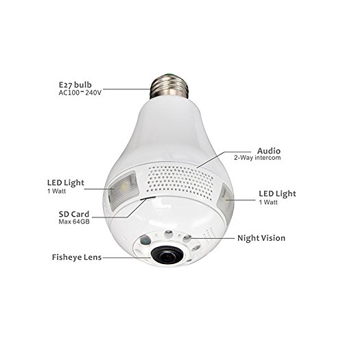 -. Feature : This is a functional 3W LED bulb with WiFi spy camera hidden in / 960P HD Fisheye 360 degree view angle support night vision / MOTION ACTIVATED or CONTINUOUS RECORDING - Use free apps to choose the recording mode that you need. Motion activated records only when there is movement, while continuous recording mode records 24/7. / RECORDS TO MICRO SD CARD - this bulb light wifi camera allows to record 960p hd video to a removeable 32GB micro sd card(16GB Free included) / STRONG NIGHT VISION - It come with 2pcs strong night vision leds to reach up to 15m night vision in darkness