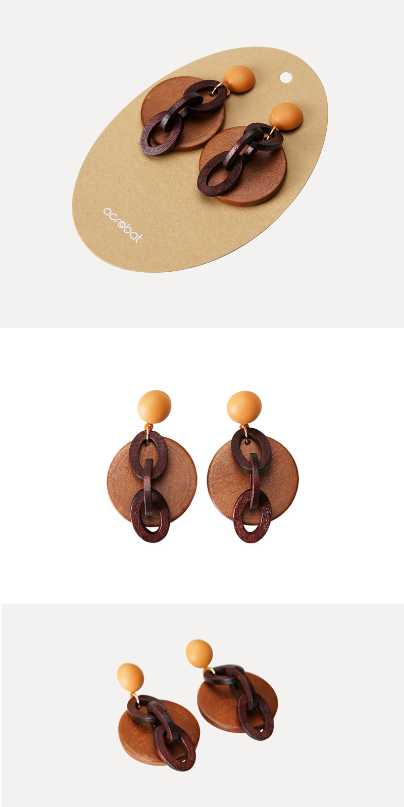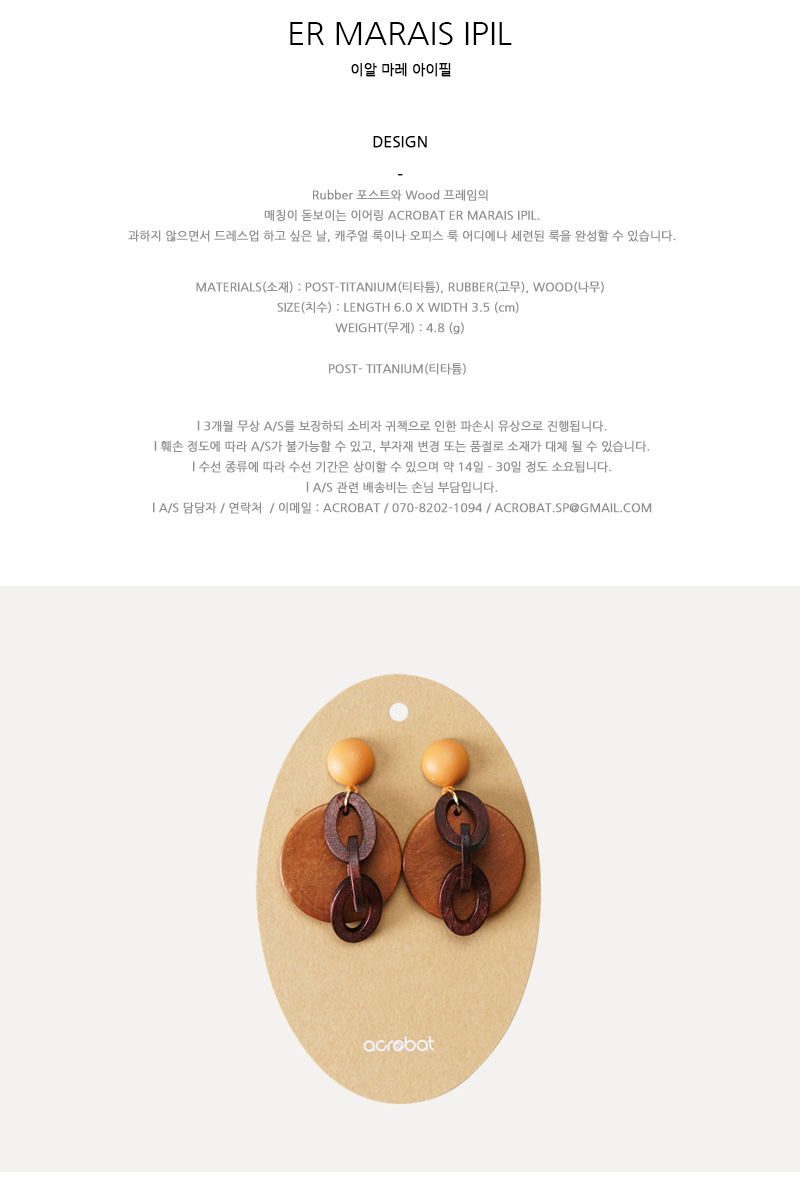 l Rubber 포스트와 Wood 프레임의 매칭이 돋보이는 이어링 ACROBAT ER MARAIS IPIL. 과하지 않으면서 드레스업 하고 싶은 날, 캐주얼 룩이나 오피스 룩 어디에나 세련된 룩을 완성할 수 있습니다.