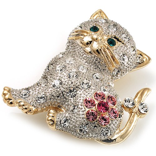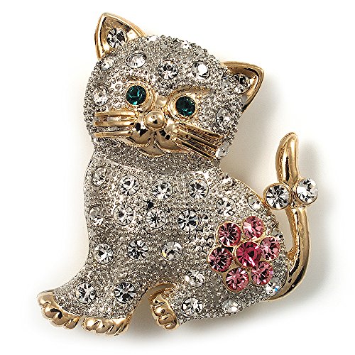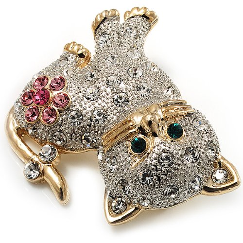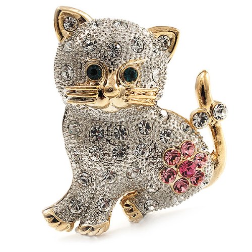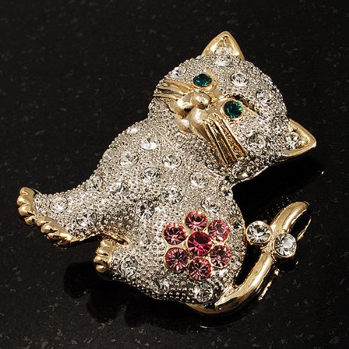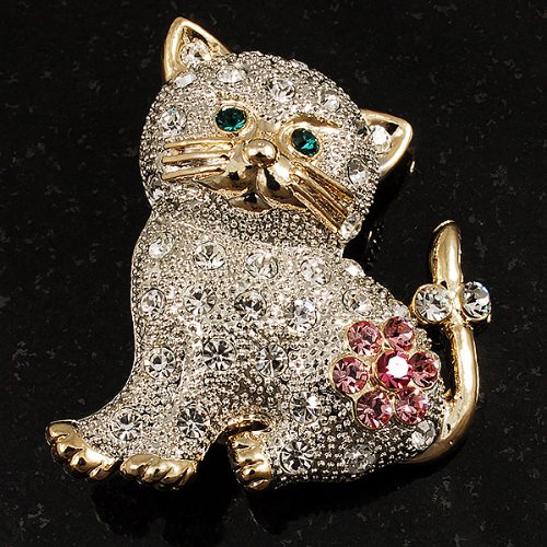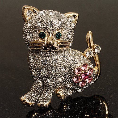 This pretty little cat brooch is a perfect present for a cat lover. Made from gold and silver plated metal and decorated with clear crystals on the body. The eyes set with two tiny emerald green stones and the tail decorated with a pink crystal flower for a charming style, so you might even want to keep her for yourself. It measures about 31mm x 41mm and fastens with a flag pin and revolver.Feature