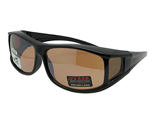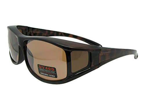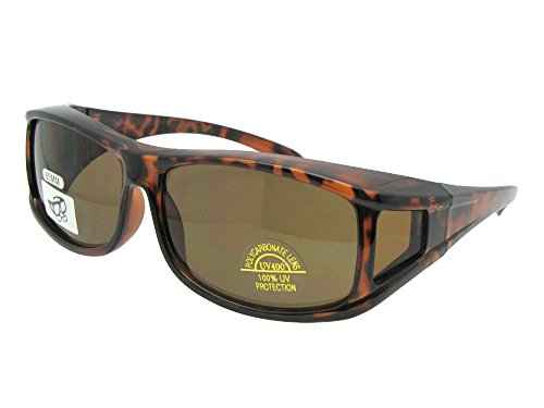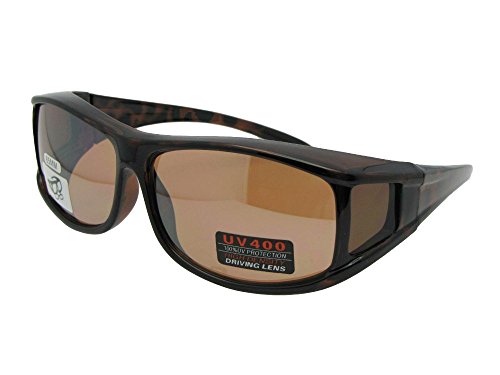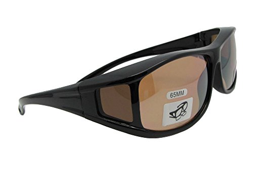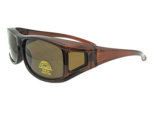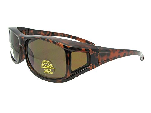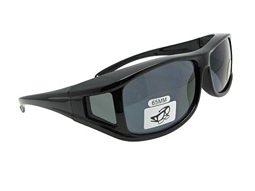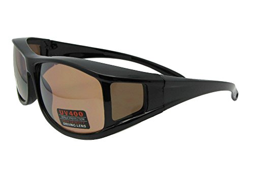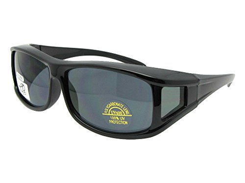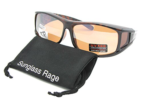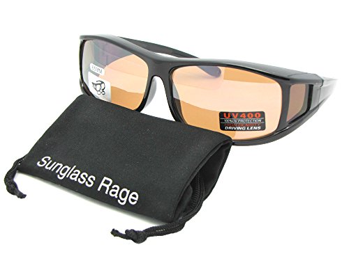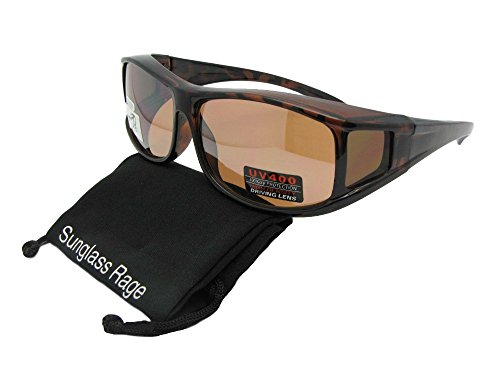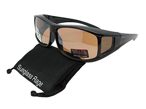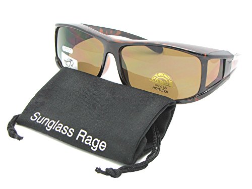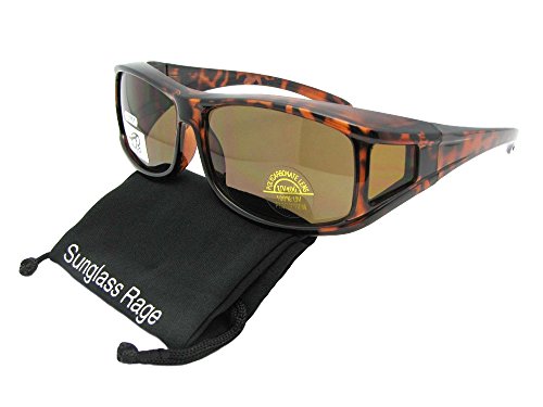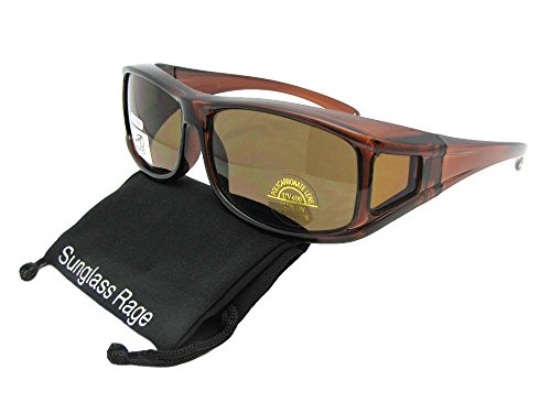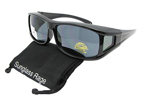 Product Description These look like a pair of regular sunglasses. The non polarized UV400 lenses are scratch resistant. They will only go over smaller to medium size prescription glasses and fit best over rectangular shaped glasses. The measurement of your prescription glasses must be smaller 5 1/2 Inches Wide x 1 3/4 Inches Height. All Sunglass Rage sunglasses come with a Sunglass Rage cleaning pouch. 0