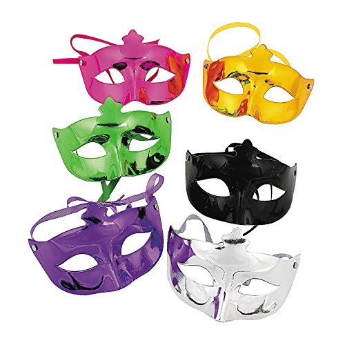 -. Binding : Toy -. Brand : Fun Express -. Color : Multi-color -. Department : unisex-adult -. EAN : 0887600838628 -. Feature : Includes 6 assorted metallic masks with ribbon ties / Traditional Mardi Gras colors - gold, black, green, purple, fuschia, silver / Rigid plastic is sturdy and can be embellished or decorated / One size fits most - teen to adults / Ideal for a masquerade ball, theme parties, New Year's Eve, Mardi Gras -. IsAdultProduct : 0 -. Label : FE -. Manufacturer : FE -. PackageQuantity : 1 -. ProductGroup : Toy -. ProductTypeName : TOYS_AND_GAMES -. Publisher : FE -. Size : one size -. Studio : FE -. Title : Assorted Plastic Metallic Mardi Gras Masks, 6 Pieces -. UPC : 887600838628
