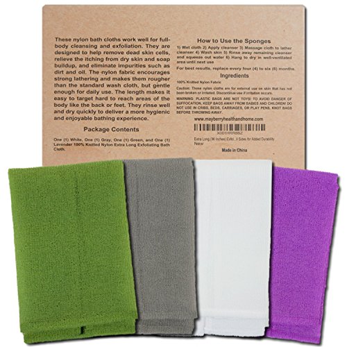Studio : Mayberry Health and Home Publisher : Mayberry Health and Home Binding : Misc. Product Description WHAT MAKES THE NYLON CLOTH BETTER THAN STANDARD WASH CLOTHS OR LOOFAHS? - The nylon fabric that is used to create these bath towels makes them rougher than a regular wash cloth which helps remove more dirt, oil, and dead skin cells. - The rough texture of the nylon feels similar to receiving a back scratch and is amazing for use on the back, feet, and other areas of the body. HOW BIG ARE THE CLOTHS? - Our cloths are approximately 11 INCHES WIDE and 36 INCHES LONG. This EXTRA-LONG DESIGN makes it easy to reach areas like the back and feet. HOW DOES AN EXFOLIATING CLOTH IMPROVE SKIN QUALITY? - They help remove excess dirt, oil, and dead skin cells; unclog pores; and eliminate impurities from the skin. SHOULD I USE THESE NYLON BATH TOWELS ON DELICATE AREAS SUCH AS THE FACE? - This depends on individual preference, but due to the rough texture, we do not recommend using the towels on the face or other delicate areas. - Please consider using one of our konjac sponges for cleansing and exfoliating the face and other delicate areas of the body. HOW OFTEN SHOULD I REPLACE THE TOWELS? - We recommend replacing the nylon bath towels every 4 to 6 months in order to ensure a hygienic bathing experience. WHY PURCHASE FROM MAYBERRY HEALTH AND HOME? - We provide beneficial and effective products. - We work hard to ensure customer satisfaction. - We can be reached before and after your purchase. - We provide a 100% MONEY BACK GUARANTEE 0 |