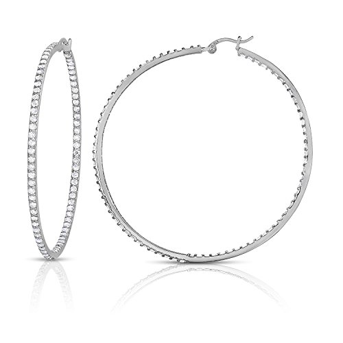 These gorgeous large hoop earrings are a classic. Polished for high shine and adorned with sparkling cubic zirconia stones these will simply amaze. The cubic zirconia stones are prong set halfway inside and outside of the hoops for optimal dazzling style. Worn casually or in formal settings, these large hoops swing with flare and glimmer and that will wow and impress all those around.Feature