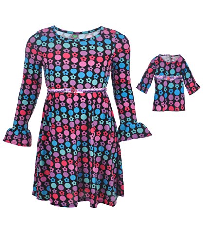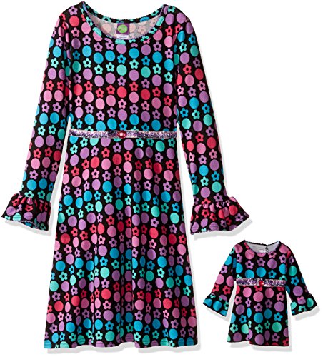 Long sleeve brushed sweater knit polka dot and floral printed dress. Comes with matching doll garment.