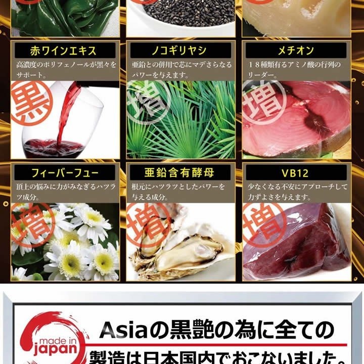 | 原材料 | 食用酵母(亜鉛、銅、ヨウ素含有)、こんぶ、ツルドクダミ末、イチョウ葉エキス、フィーバフューエキス末、ゴマ抽出物(セサミン含有)(ごまを含む)、赤ワインエキス末、ローヤルゼリー、ノコギリヤシエキス粉末/セルロース、ステアリン酸カルシウム、微粒酸化ケイ素、L-チロシン、L-メチオニン、ビタミンB12 |