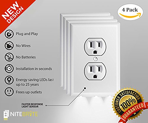 (4 PACK) - NiteBrite Outlet Wall Plate With LED Night Lights - Installs In Seconds - No Batteries Or Wires Needed (Duplex 4 Pack)