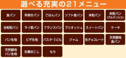 ◆인기의 천연 효모나 브리오《슈메뉴》등,21메뉴를 탑재.메뉴:식빵,조구이 빵,밥 빵,소프트 식빵,미분 빵(글루텐 들어감)고, 미분 빵,전입분빵,호밀 빵, 프랑스 빵,브리오《슈》,스위트 빵,케익,빵 원단,피자 원단,파스타 우동,잼,쵸코렛, 천연 효모 식빵,천연 효모 빵 원단,생종 부흥,떡◆밥 빵은 독립 메뉴가 되었습니다.◆선택할 수 있다크기(0.5근/1근)◆사용하기 쉽은 콤팩트크기. / ■ 사양 ■1근타입 본체크기(약):폭25.1×(길이)깊이30.9×높이27.9cm 중량:약4.0kg 소비전력:560W 타이머:최장13시간(10 분단위) 코드장:약1.0m 부속품:계량 컵,계량 스푼 /