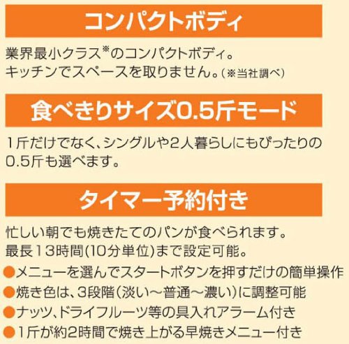타이머:최장13시간(10 분단위) 고, 식빵의 가루(소맥분)용량:150g(0.5근)250g(1근)