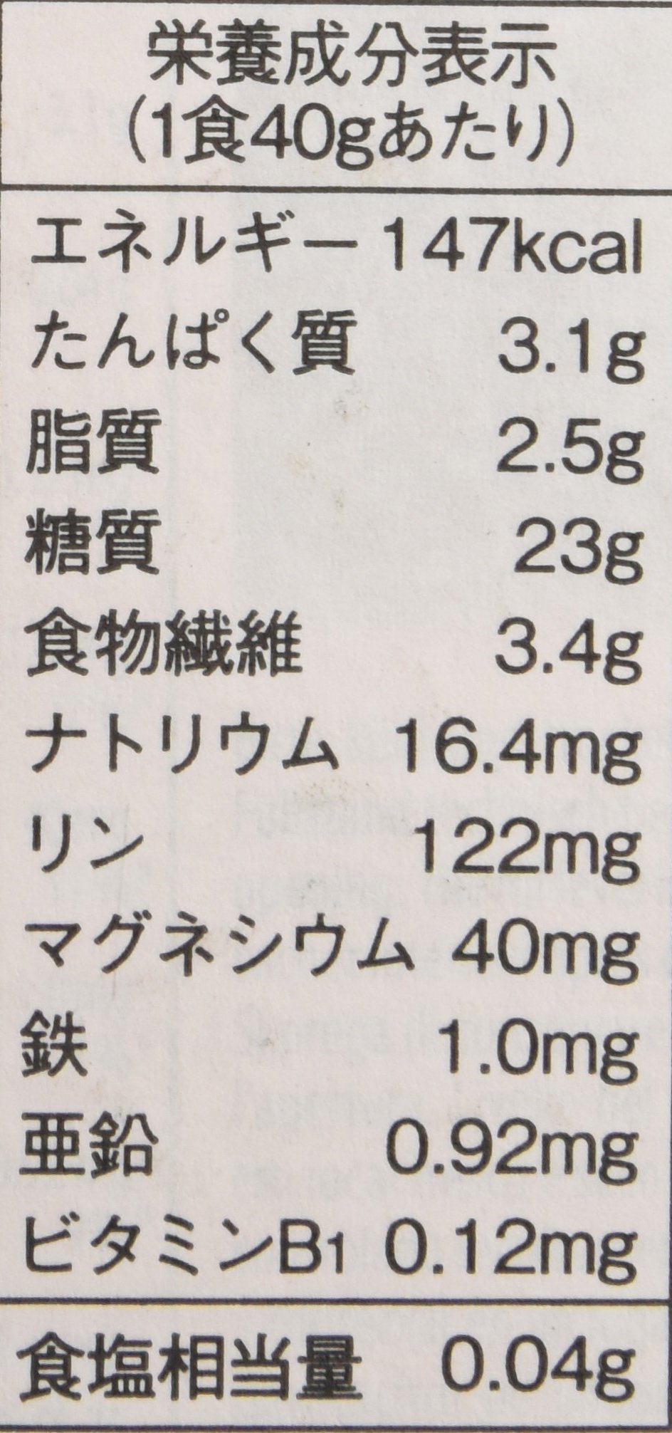 3 g of protein per 40 g of meal, 2.5 g of lipid, 23 g of carbohydrate, 3.4 g of dietary fiber, 16.4 mg of sodium, 122 mg of phosphorus, 40 mg of magnesium, 1.0 mg of iron, 1.0 mg of iron, 0.92 mg of zinc, 0.12 mg of vitamin B1, 0.04 g