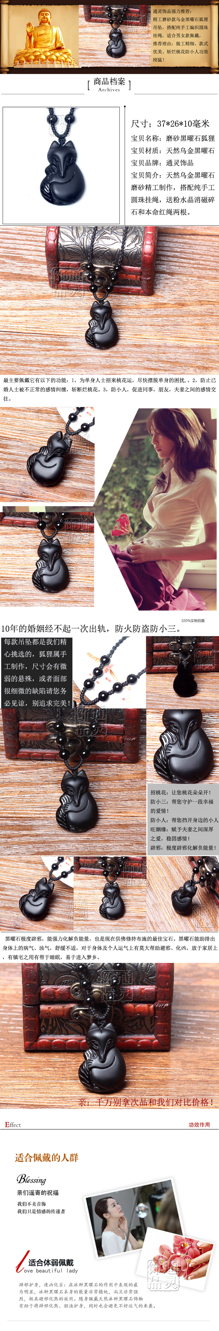In Feng Shui the fox like a strong induction of peach blossom has enhanced the popularity of the utility. Choose a appropriate place in the bedroom to put a statue of a fox like or often wear the fox like jewelry for his attract more popular, especially the straight edge. The fox often like topink and black is best: pink to Bo straight edge is not a good person is best to obtain a statue of fly fox to enhance self charm; black exclusivelystraight edge too busy people choose this for his own block rotten peachseek true love. If the peach blossom too Wang lead me love lifeconfusion recommend the use of obsidian are carved into the fox in the body or placed in the home bedside there is suppression of the role ofthe peach peach blossom energy transferred to the black fox anddissolve. Obsidian fox said that can avoid the husband not to make thepeach blossom! You do not prevent a try! Peach blossom sounds good,but to have a right man friend, this is not what good news. The Obsidianfox gift he (she) can resolve the unnecessary trouble let your feelingsenduring as the universe. Let the Obsidian fox guard you only love!! If there are peach words the other half you, can let its wearing black foxthere will be the "affair of fate" all transferred to the "Fox" with this resolve,the parties can relaxed many have more energy and time on your business! If not convenient to wear can be put in a pocket car bagpillow mattress.