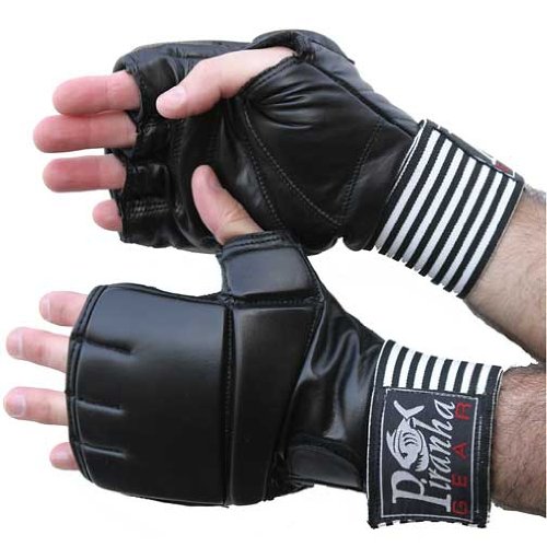 -. Binding : Misc. -. Brand : Piranha Gear -. Feature : We first intended these for people that practice MMA or UFC mixed martial arts... / ...but they work just as well for Karate, Boxing, and during general grappling. / Solid gel padding fantastic at absorbing impact. Ideal for anyone that does heavy bag work. -. Label : Piranha Gear -. Manufacturer : Piranha Gear -. Model : 31-1-602 -. MPN : 31-1-602 -. PartNumber : 31-1-602 -. ProductGroup : Sports -. ProductTypeName : SPORTING_GOODS -. Publisher : Piranha Gear -. Studio : Piranha Gear -. Title : MMA Adjustable Gel Leather Fight Gloves - Piranha Gear