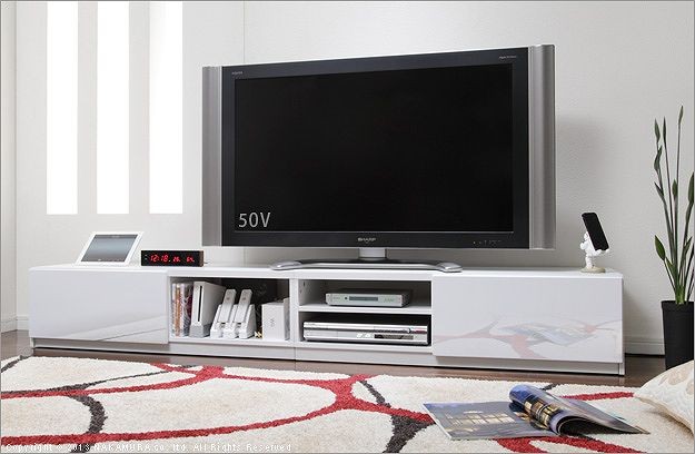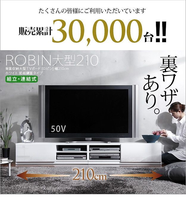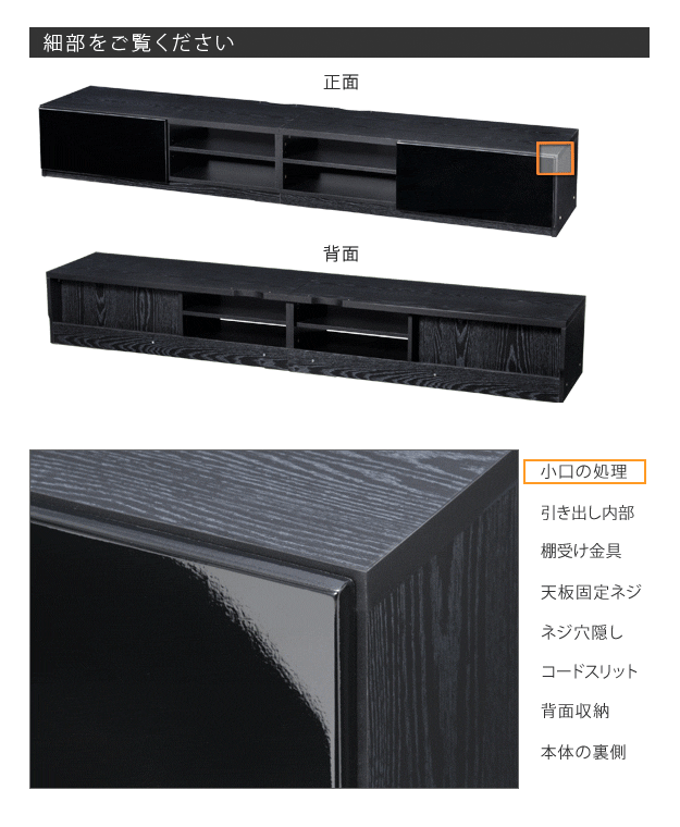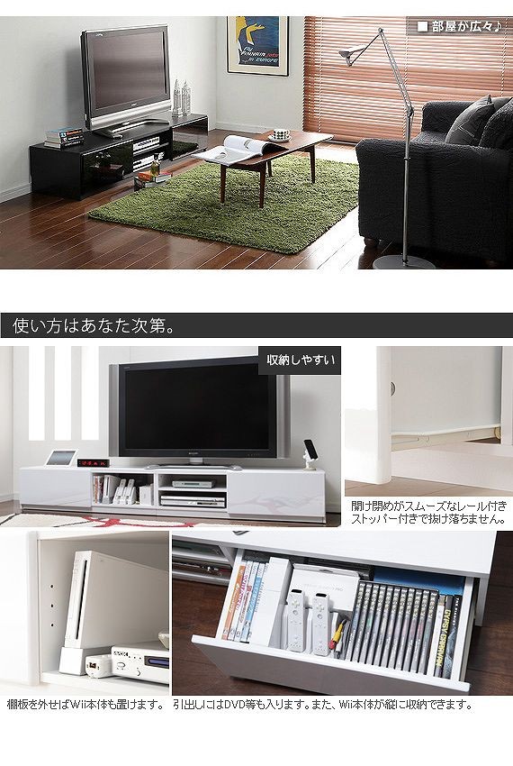 商品について:大型テレビ対応!背面収納タイプのTVボード。引出しの前板はほど良い光沢の鏡面仕上げ。背面にはコード収納スペースがあるのでコンセント類や配線もスッキリ収まります。キャスター付きで配線作業、お掃除もラクラク。可動棚板4枚付き。