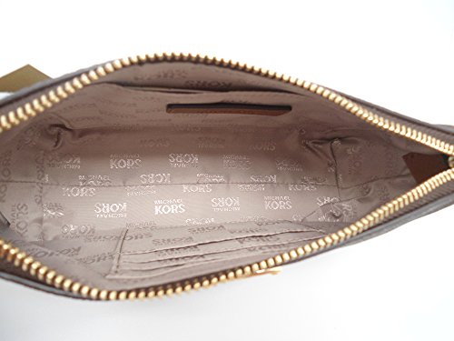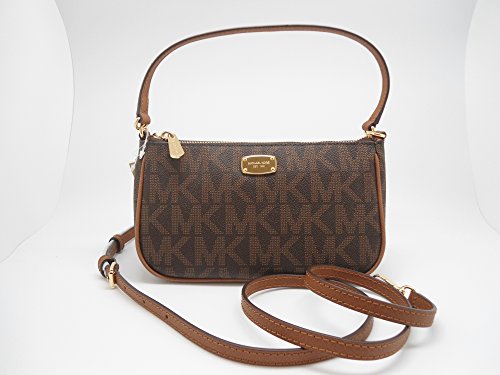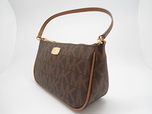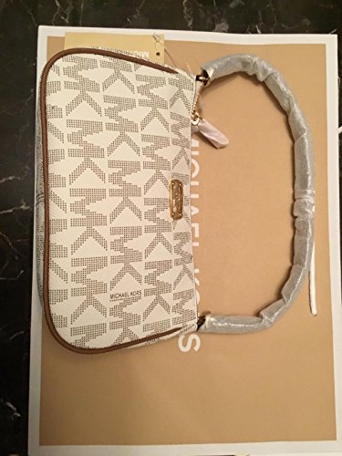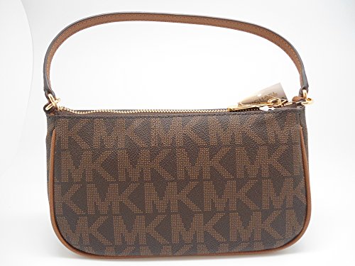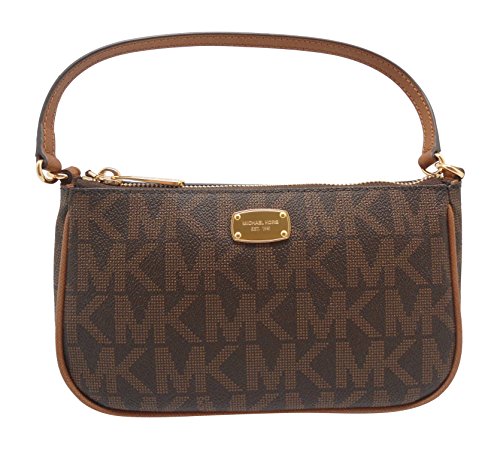 Product Description Michael Kors Jet Set Medium Convertible Pouchette is crafted in PVC coated twill printed in pin dot monogram pattern. It is finished with leather trim and polished golden tone hardware. The interior is lined in custom logo print fabric and features an open slip pocket and 3 card slips. It has a fully zippered top closure, and the front is accented with Michael Kors nameplate. It has a single top handle with a 6 inch drop, or you can use the removable and adjustable shoulder strap. The overall measurements for this compact bag are approximately 8 inches (L) x 4.75 inches (H) x 3 inches (W) and has an MSRP of $198.00. 0