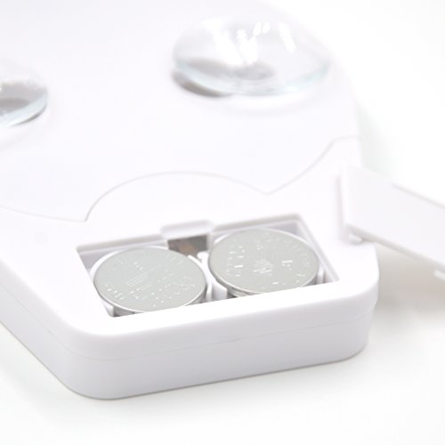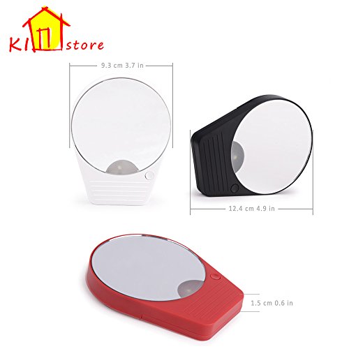 - Feature : 3.6 inches diameter design LED lighted mirror with two detachable suction cups on the back / The 10X magnifying mirror lets you see the tiniest details to line your lips, apply eye makeup, tweeze eyebrows / There is a LED light covered by dull polish glass, make the light more soft and comfotable to look at. / Perfect to use at home, in the office, and in traveling. Youu can stick it on any smooth surface like tiles, glass, plastic, metal coating surface etc. / Operates with tow button batteries(not include).