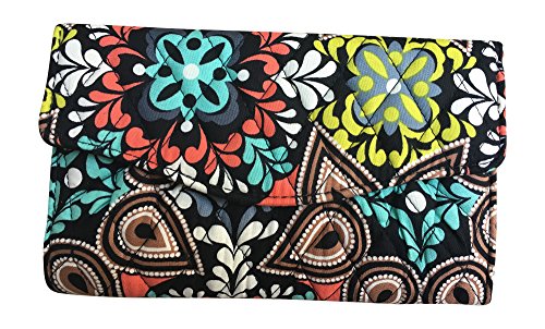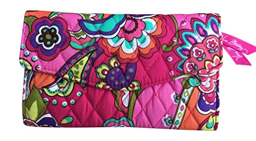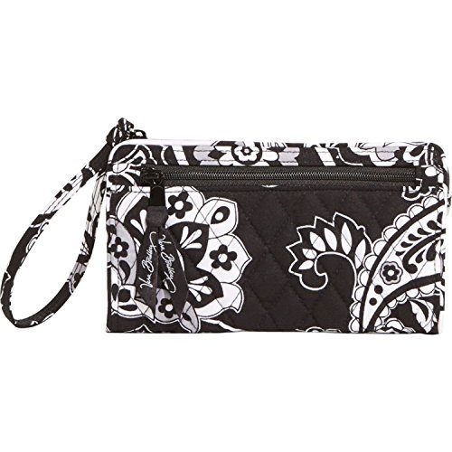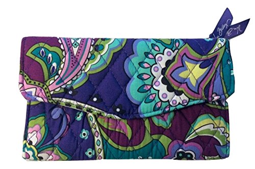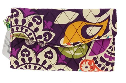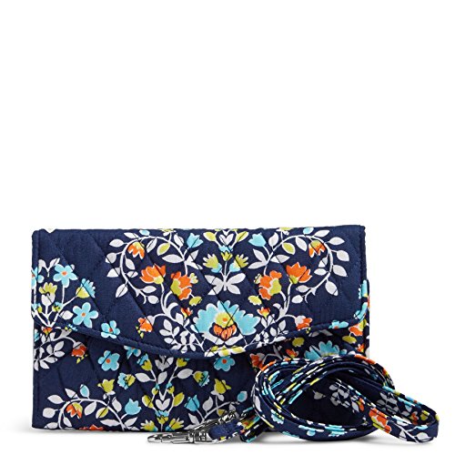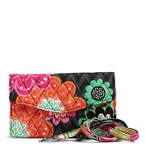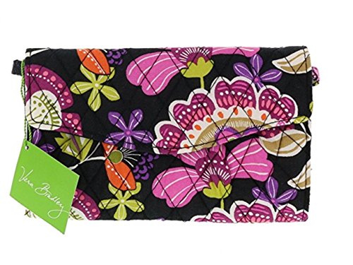 Wrapped in Vera Bradley's iconic print this strap wallet is a wallet and cross-body all in one! The magnetic snap closure secures an interior offering 12 card slots, a clear ID window and 3 full length bill compartments. The back offers a zippered pocket and a semi accordion zippered coin compartment. The removable strap offers a drop of about 23 inches. It measures approximately 7.5 inches (L) x 4.25 inches (H) x 1 inch (W). Patterns with solid color interiors are designed and manufactured for Vera Bradley Outlets.Feature