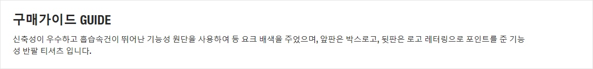 신축성이 우수하고 흡습속건이 뛰어난 기능성 원단을 사용하여 등 요크 배색을 주었으며, 앞판은 박스로고, 뒷판은 로고 레터링으로 포인트를 준 기능성 반팔 티셔츠 입니다.