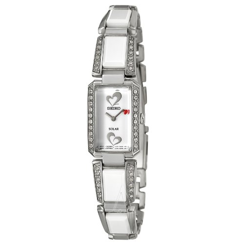 -. Title : Seiko SUP185 Womens Tressia Solar White Ceramic and Stainless Steel Bracelet Swarovski Elements Heart Logo Watch