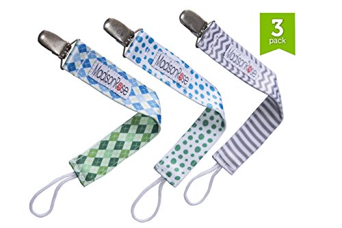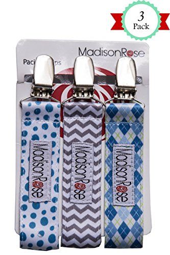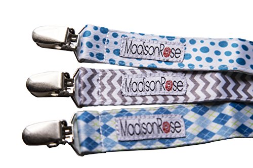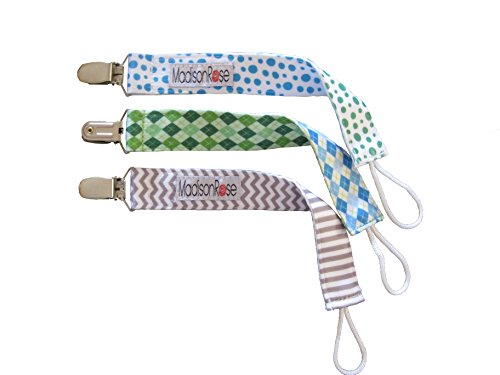 -. Title : Madison Rose Pacifier Clips/Holder Trendy & Stylish Pacifier Clips for Boys Universal Design Fits All Pacifiers, Two-Sided Design, Set of 3