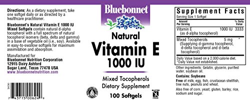 Bluebonnet's natural vitamin e mixed soft gels provide the popular, natural d-alpha tocopherol with a full spectrum of natural tocopherol isomers (beta, delta and gamma) in a base of vegetable oil (i.e., soy). Available in easy-to-swallow soft gels for maximum assimilation and absorption. Vitamin e is a powerful, fat-soluble antioxidant that helps protect cell membranes against damage caused by free radicals and prevents the oxidation of ldl cholesterol. It is necessary for the structural and functional maintenance of skeletal, cardiac, and smooth muscle. It also assists in the formation of red blood cells and helps to maintain stores of vitamins a and k.Feature