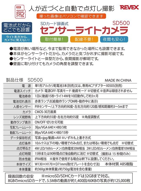 | 電池式だからどこでも簡単設置。本体がセンサーライトなので、カメラだと気づかれにくくなっています。センサーライトの照明で撮影するから、夜間でもカラーで撮影できます。 |