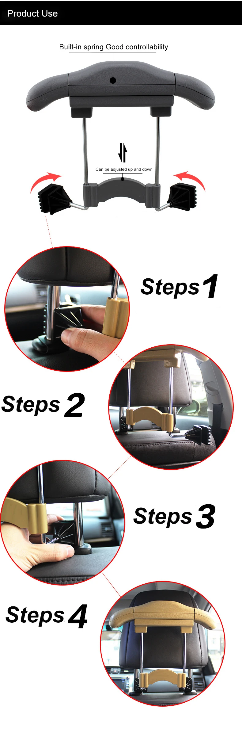 Easy to mount on the round head restraint rods: mounting or dismounting within 10 seconds.