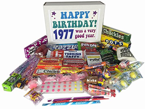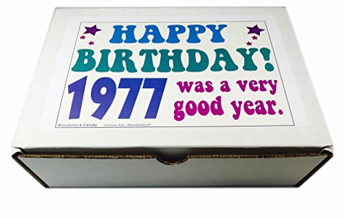 -. Binding : Misc. -. Brand : Woodstock Candy -. Feature : Contains 30 different kinds of retro nostalgic candy for an unforgettable 40th birthday gift / 1977 birthday gift box will bring back great childhood memories / Makes a fun and festive gift for any candy lover / Great for someone who has everything / Box measures 9.5 x 7 x 3 inches and comes shrink wrapped -. IsAdultProduct : 0 -. Label : Woodstock Candy -. Manufacturer : Woodstock Candy -. PackageQuantity : 1 -. ProductGroup : Grocery -. ProductTypeName : GROCERY -. Publisher : Woodstock Candy -. Studio : Woodstock Candy -. Title : 1977 40th Birthday Gift Box Retro Nostalgic Candy Born '70s Jr