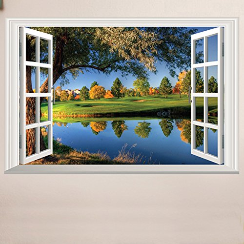 Dnven (24"w X 16"h) 3D High Definition Peaceful Lake Big Trees Clean Rivers Nature Forests Scenery False Faux Window Frame Window Mural Vinyl Bedroom Living Room Playroom Wall Decals Stickers