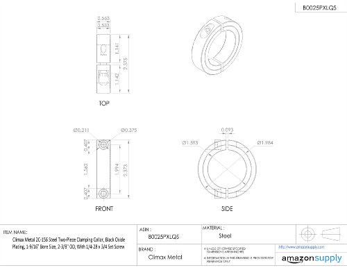 Climax Metal 2C-156 Steel Two-Piece Clamping Collar, Black Oxide Plating, 1-9/16" Bore Size, 2-3/8" OD, With 1/4-28 x 3/4 Set Screw