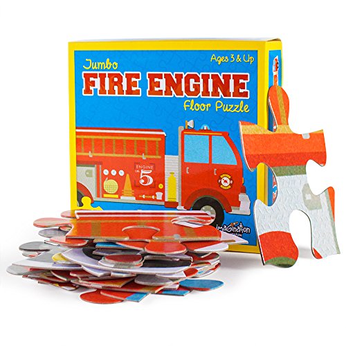 Studio : Imagination Generation Publisher : Imagination Generation Binding : Toy Product Description This fire engine floor puzzle is sure to keep little hands busy. Consisting of 24 jumbo pieces, when fully assembled this fire engine reaches over 3 feet long! Puzzles are great tools for developing your child's fine motor skills, as well as their cognition and ability to solve problems. Even better, this puzzle invites collaboration! Lend your toddler a hand in placing the pieces, or pack up the puzzle into the sturdy, reusable box and take it on a playdate. This puzzle contains hours of jumbo-sized fun in a tiny, portable package. Delight Is in the Details Rendered with a unique, crayon-and-construction-paper texture, this puzzle's art may look simple, but it's full of small details! Have your child identify and call out the fire hose, pressure gauges, and orange traffic cones; the fire axe, extinguisher and wooden ladder; the siren, flashing lights, first aid kit, fire department emblem, and more! Sized for Small Hands Thick, durable cardboard pieces up to 7" wide are easily manipulated by toddlers. And the simple, chunky connectors ensure an easy, secure fit when putting the puzzle together. The heavy-duty, toddler-tested construction stands up to teething, gentle bending and rough handling, even little footsteps. This item is suggested for ages 3-5 years old. 0