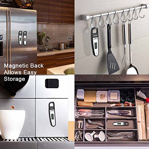 - 【SMART DESIGN】: AUTO-SHUT OFF to save battery life if readout stays for 10 minutes. EASY STORAGE: Magnetic back allows easystorage on refrigerator door or barbecue rack. Hanging hole is handy for wall hook. The temperature probe is protected in the folded position.