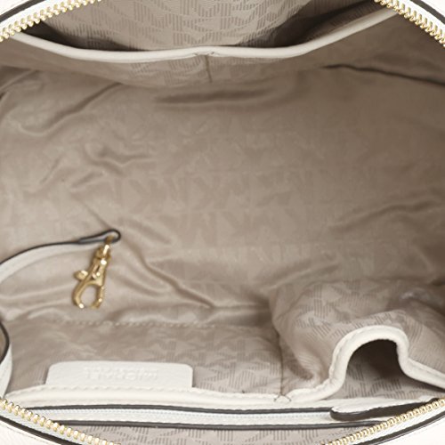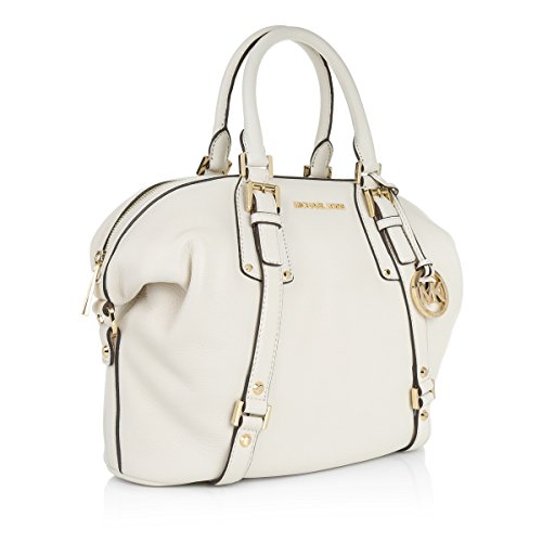Michael Kors Vanilla Bedford handbag/ Satchel, Leather with gold tone hardware. Dual top handle with an adjustable & removable crossbody strap .Zip closure. MK signature lining with interior cell sleeve, sleeve pockets & zip pocket. MK logo circle charm and feet on base.Feature
