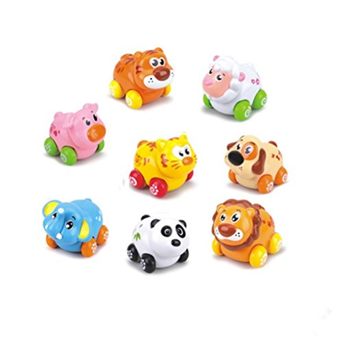 This car toy set includes 8 different colorful no battery requaired cartoon animal cars: panda, pig, elephant, tiger, cat, dog, sheep, lion.