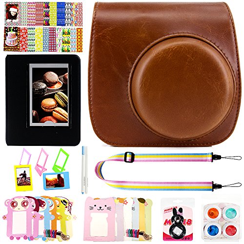 Elvam Camera Accessory Bundles Set for Fujifilm Instax Mini 8 / Mini 8+ / Mini 9 (Camera Case/Camera Strap/Album/Photo Frame/Desktop Frame/Film Sticker/Lens Filter/Marking Pen) - Vintage Brown