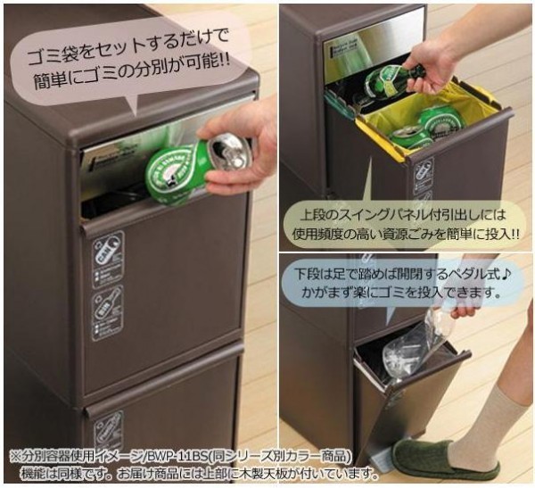 資源ごみをひとまとめにストックできる分別容器2段タイプ☆天板トップにはインテリア性を考慮した耐熱性メラミン木天板を付属。 |