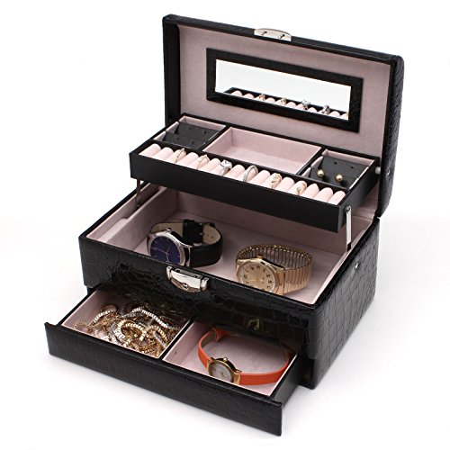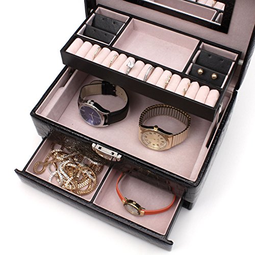 -. Binding : Kitchen -. Brand : NuLink -. EAN : 0683258993579 -. Feature : STYLISH DESIGN: Prefect and compact way to keep rings and other small jewelry organized in one place. 3 different layers to separate jewelries & rings / TOP QUAILTY: Made of quailty black leather and quailty velvet. Fully protection for your value or beloved jewelry from scratch and damaged / EASY & CONVIENCE LOCK & KEY: Build in convience lock and key to protect valueable jewelry steal. Prefect case and most safe way to protect personal items. / PRODUCT SPECIFICATION: Exterior Color: Black; Material: PU Leather, Velvet; Finish: Crocodile Finished Texture; Box Size: 9.75" x 6.75" x 5.25" (LxWxH); Fits: Up to 15 rings, and 11 compartments for small miscellaneous jewelry / All NuLink products GUARANTEE defect free/ damaged & come with 1 Year warranty. Message us if you have any problems -. IsAutographed : 0 -. Label : NuLink -. Manufacturer : NuLink -. Model : NL-16825BK -. MPN : NL-JD168-25BK -. PackageQuantity : 1 -. PartNumber : NL-JD168-25BK -. ProductGroup : Home -. ProductTypeName : HOME -. Publisher : NuLink -. Studio : NuLink -. Title : NuLink Black 3 Layers Rectangale Jewelry Box Display Storage Organizer Case with Mirror, Lock & Key -. UPC : 683258993579