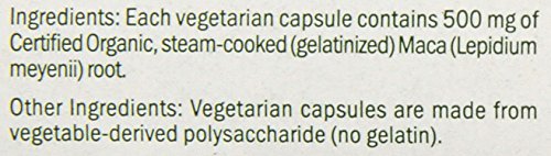 -. Feature : Promotes healthy sexual libido, function and fertility. / Each vegetarian capsule contains 500 mg of certified organic, gelatinized Maca powder. / Gelatinized to aid absorption and utilization in the body. / Vegan, vegetarian, gluten-free and non-GMO.