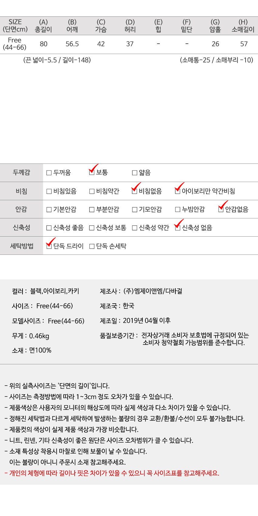 | 특이 사항 | 배송, 변경, 반품 환불에 대한 문의는 위 연락처로 문의 주세요. | ||