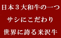 ![]() | ![]() 日本人好みの徹底して「サシ」にこだわった和牛。和牛とは日本特有の品種で日本短角種、無角和種、褐色和種の4種を指します。 肉の断面にみえる細やかな脂の霜降りがおいしさの秘密。 口の中でとろけるような伝統の味わいと美味しさを併せもつ類い稀な牛肉米沢牛。柔らかな食感と美味しい旨味が詰まった肉汁が特徴です。 ![]() |