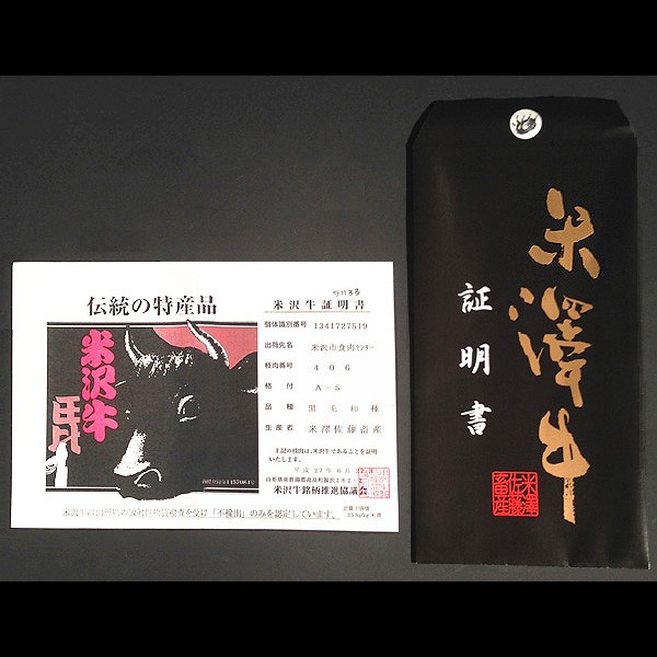 ![]() | 米沢牛は、商標登録(第1457084号)され、高い品質を維持する流通管理により、まちがいないブランド牛として「米沢牛」は愛され続けています。 下記の条件をすべて満たしたものを「米沢牛」と認定し、本物の米沢牛は、枝肉に証明印を押印、厳しく管理されています。 1) 飼育者は、置賜三市五町(米沢市、南陽市、長井市、高畠町、川西町、飯豊町、白鷹町、小国町)に居住し米沢牛銘柄推進協議会が認定した者で、登録された牛舎での飼育期間が最も長いものとする。 | |