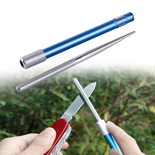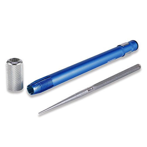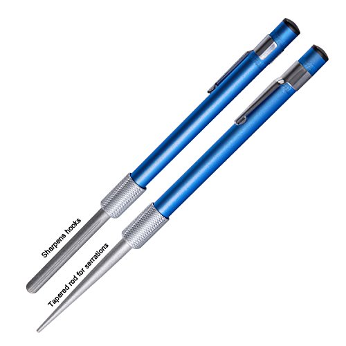 Sharpening groove for fish hooks and pointed tools. Tapered end of diamond coated rod sharpens serrations and gut hooks.