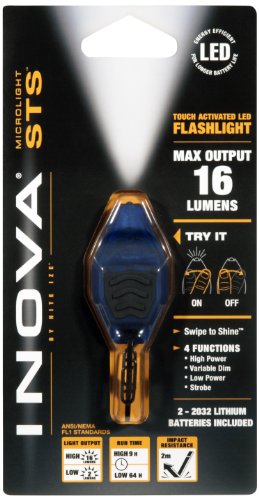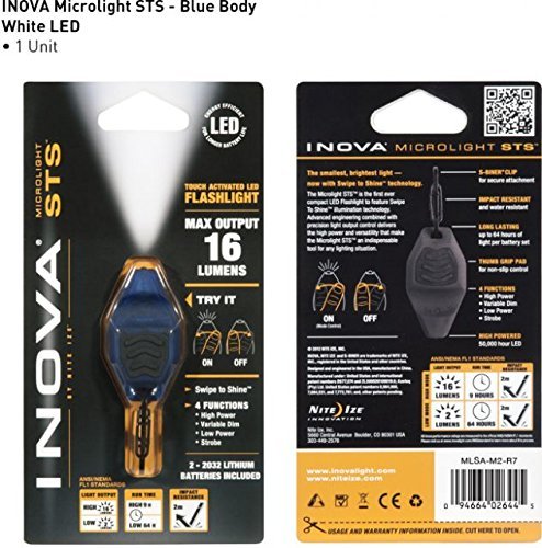 Studio : Nite Ize, Inc. Publisher : Nite Ize, Inc. Binding : Tools Home Improvement Product Description Featuring innovative "Swipe To Shine" touch technology, the INOVA Micro light STS is compact, convenient, and impressively powerful. Its durable, water-and-shock-resistant casing is designed to fit comfortably in your hand. It's our brightest INOVA Micro light, with an impressive 16 lumens. The white LED is activated nearly instantly with a quick right-to-left swipe of the thumb, eliminating the need to fumble with a switch. High, variable dimming, low, and flash modes allow you to use the light for everything from reading maps to finding keyholes to sending alert signals. The included versatile S-Biner Stainless Steel Double Gated Carabiner can be clipped to key chains, belt loops, zipper pulls, purse or backpack straps to keep your Micro light STS conveniently where you need it, when you need it. Powered by 2 replaceable 2032 lithium batteries (included). 0