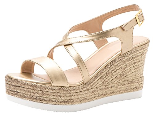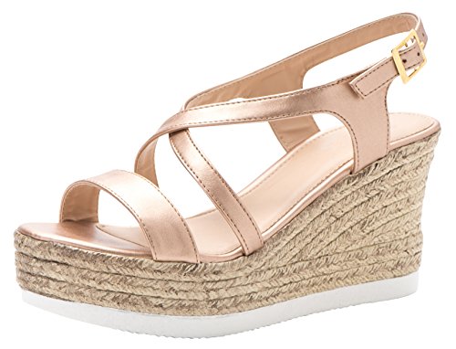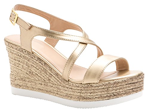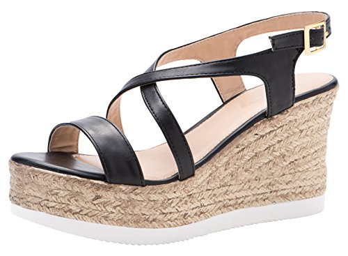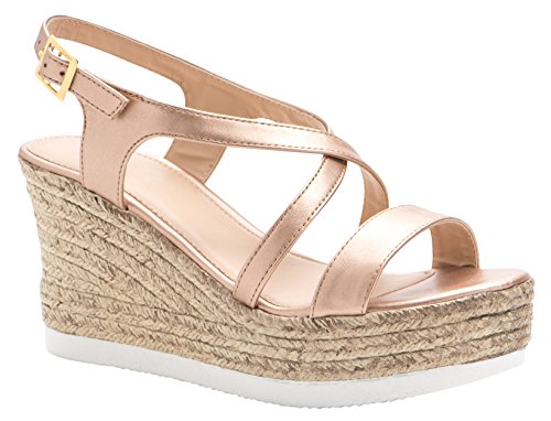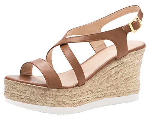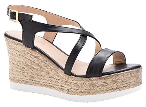 Product Description This wedge sandal from Cambridge Select features crisscross vamp straps, adjustable buckled slingback strap, and espadrille-style mixed media platform and wedge. Imported. 0