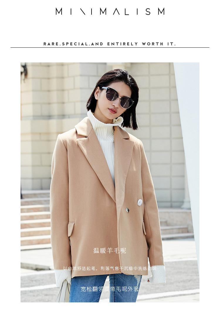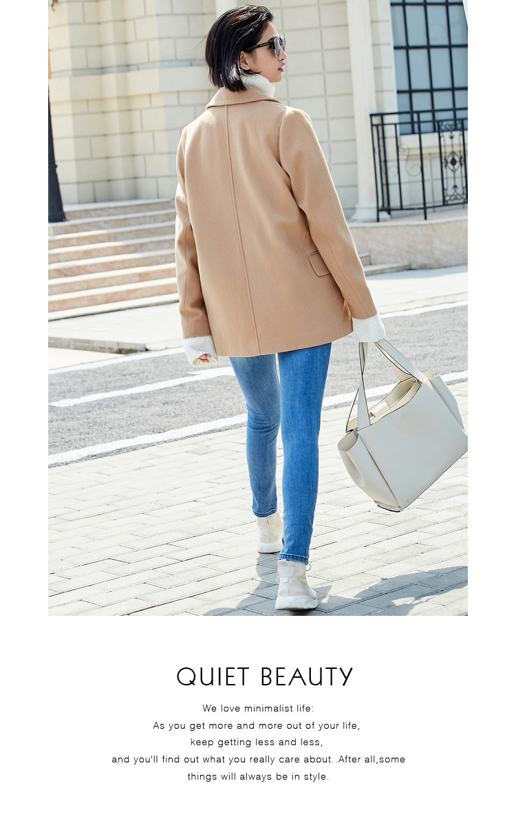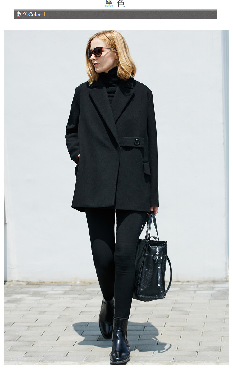 | 面料成分: | 驼色:面料:52%聚酯纤维 48%羊毛 里料:100%聚酯纤维 黑色:面料:51.1%聚酯纤维 48.9%羊毛(含微量其他纤维) 里料:100%聚酯纤维 |